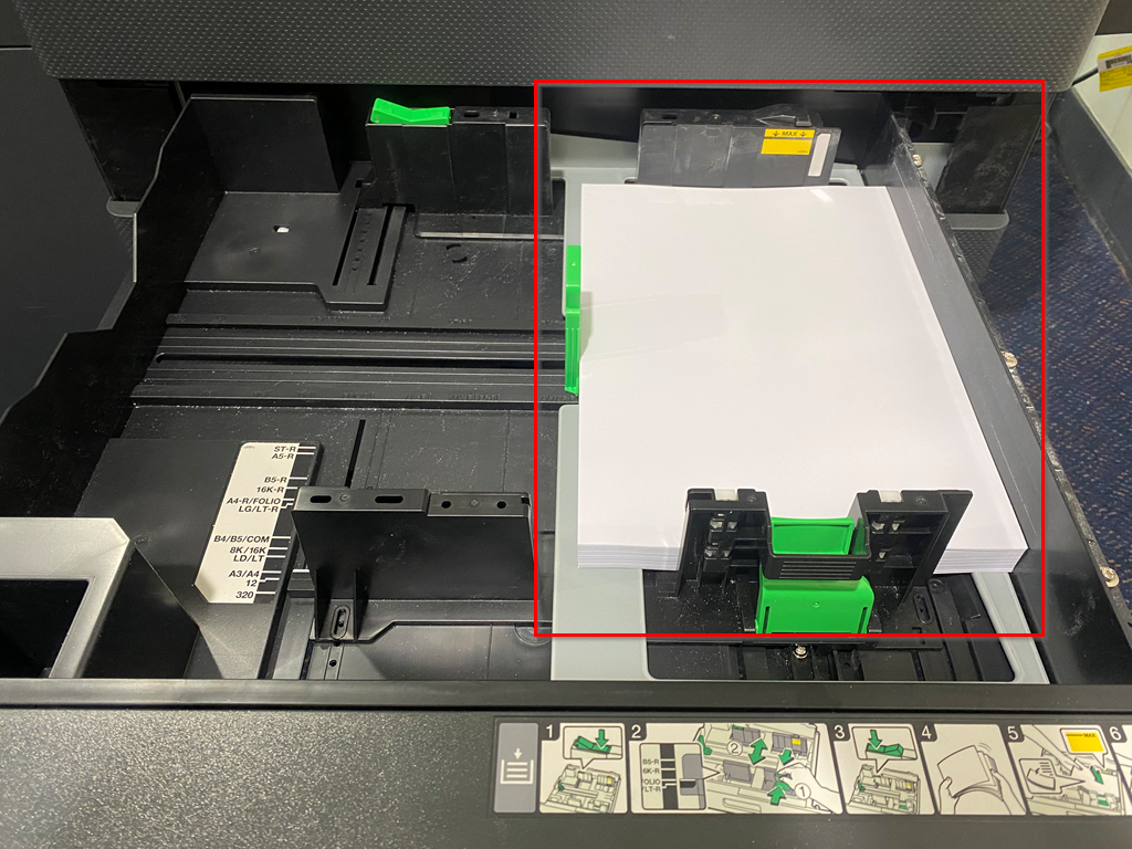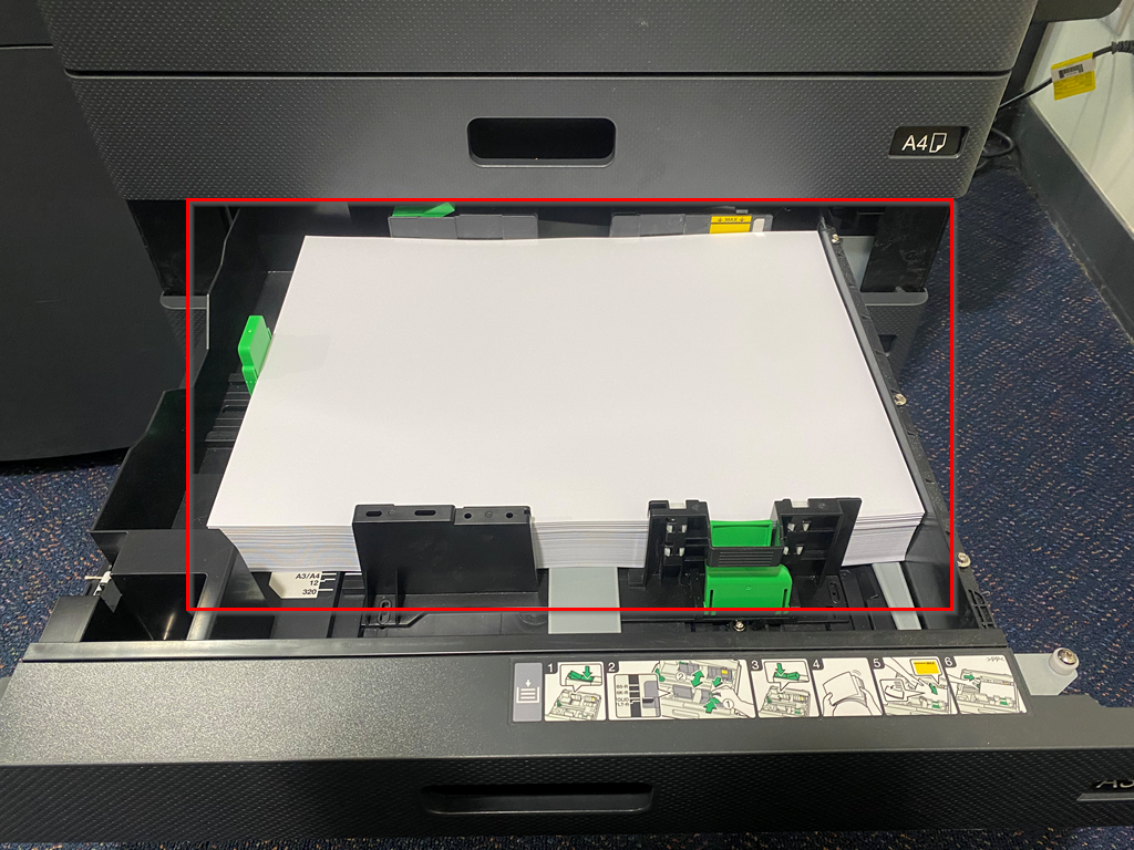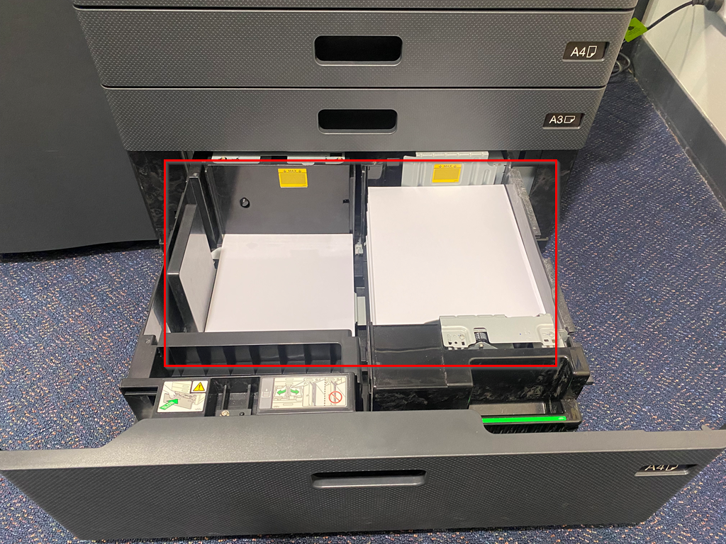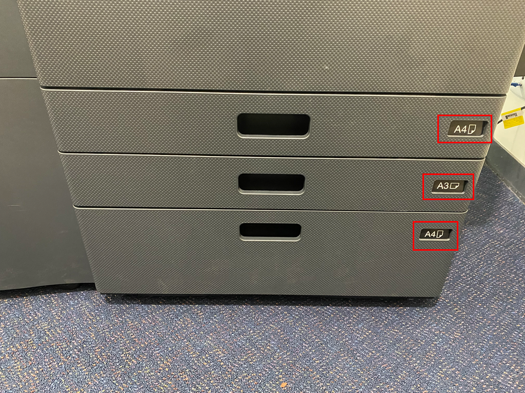All printers have three paper trays, this includes one A4 tray, one A3 tray and one large capacity A4 tray (bottom), the front of each tray will also have a label to denote which paper size it accepts: